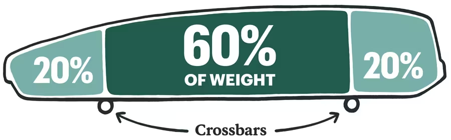 Verteilen Sie das Gewicht so, dass sich der Großteil davon zwischen den Querstangen befindet: Eine gute Faustregel ist, etwa 60 % des Gewichts, das Sie transportieren, in die Mitte der Box zu legen, sodass es sich zwischen den Querträgern Ihres Dachgepäckträgers befindet. Die restlichen 40 % können gleichmäßig zwischen Vorder- und Rückseite aufgeteilt werden.