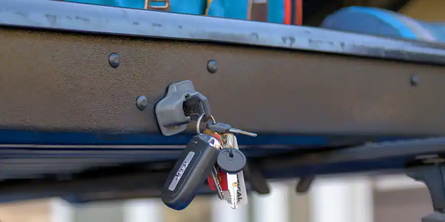 Denken Sie daran, Ihre Frachtbox zu schließen: Das klingt vielleicht selbstverständlich, aber glauben Sie uns, wenn wir Ihnen sagen, dass Leute mit offenen Boxen losgefahren sind. Hier ist ein Tipp, um dies zu vermeiden: Der Schlüssel für eine Dachbox kann normalerweise nicht aus dem Schloss gezogen werden, wenn die Box unverschlossen ist. Wenn Sie also den Schlüssel für Ihre Dachbox immer am selben Schlüsselbund wie den Schlüssel für Ihr Auto tragen, ist es unwahrscheinlich, dass Sie mit offener Box losfahren.