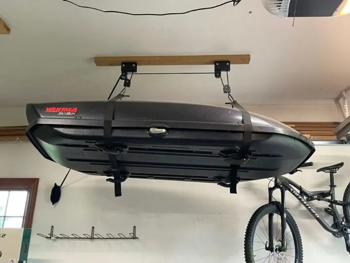 Wir haben eine Dachbox, die wir selten benutzen. Wir brauchten sie in der Garage, also haben wir sie an die Decke gehievt! Ein einfaches Flaschenzugsystem eignet sich für Dachgepäckträger, Kajaks, Kanus, Paddleboards oder sogar Fahrräder. Das Ziel: Sachen vom Boden heben, damit man Platz zum Parken und Arbeiten hat!