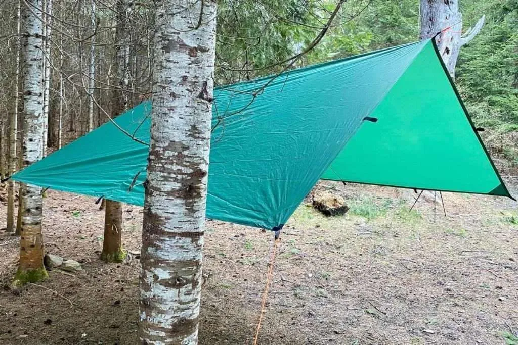 Hängen Sie Ihre nasse Kleidung auf eine improvisierte Wäscheleine oder an Äste, abseits Ihres Campingplatzes, aber immer noch unter dem Schutz der Plane.