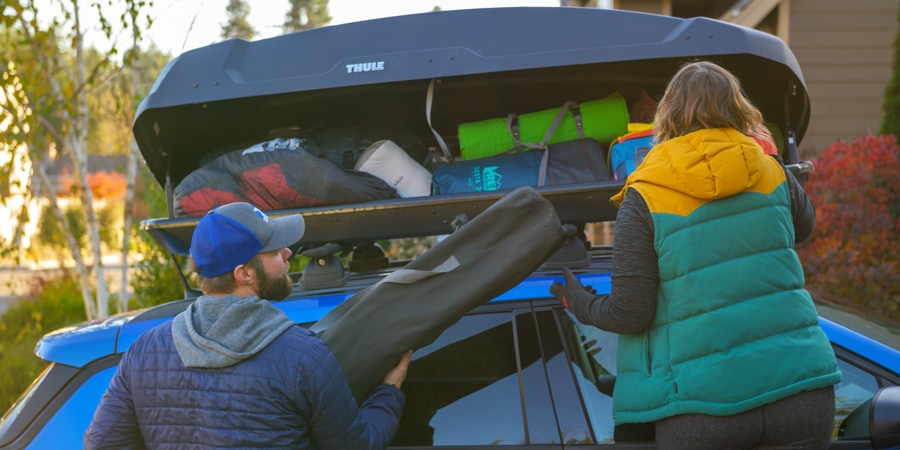 Dachboxen: Hartschalen Frachtboxen sind langlebiger, können ungewöhnlich geformte Gegenstände aufnehmen und bei jedem Wetter viel Ausrüstung transportieren. Sie sind viel teurer als Gepäckkörbe oder -taschen und nehmen Stauraum weg, wenn sie nicht im Fahrzeug sind. Viele lassen sich auf beiden Seiten öffnen, um das Beladen zu erleichtern. Um die meisten von ihnen verwenden zu können, benötigen Sie einen Basis-Dachträger mit Querträgern.
