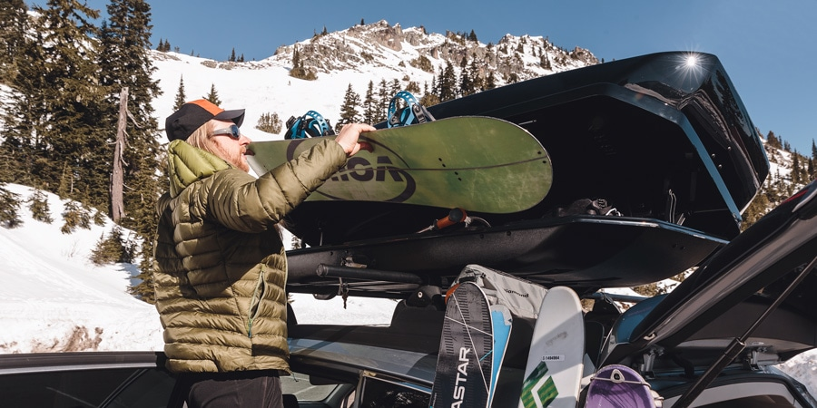 Frachtboxen: Geschlossene, wetterfeste Frachtboxen sind eine weitere Möglichkeit, mehrere Skier und Snowboards zu transportieren. Frachtboxen erfordern zur Befestigung einen Dachträger. Sie sind im Vergleich zu den anderen Optionen zum Transport von Skiern und Snowboards teuer, aber sie sind auch vielseitig einsetzbar, wenn Sie andere Aktivitäten wie Camping planen.