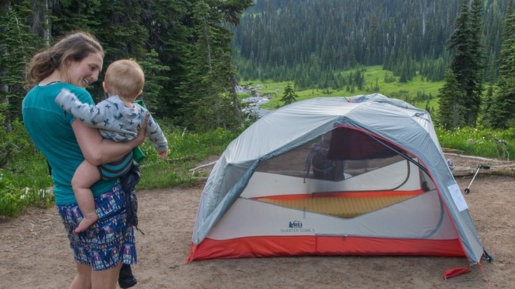 - Wählen Sie Campingplätze mit Annehmlichkeiten: Ein Campingplatz mit Badezimmer und Spielplatz in der Nähe entspricht wahrscheinlich nicht Ihrer Vorstellung von einem echten Ausflug in die Wildnis, aber mit einem Baby im Schlepptau können diese Dinge sehr praktisch sein, insbesondere bei Ihren ersten oder zweiten Ausflügen. Wenn Sie sich beim Camping als Familie wohler fühlen, können Sie weiter weg fahren.