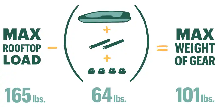 Ejemplo: Wenn die maximale Gewichtskapazität Ihres Fahrzeugs 165 Pfund beträgt und Ihre Dachbox 50 Pfund wiegt, Ihre Querträger 9 Pfund und Ihre Türme/Füße 5 Pfund wiegen, dann können Sie bis zu 101 Pfund in die Dachbox laden.
