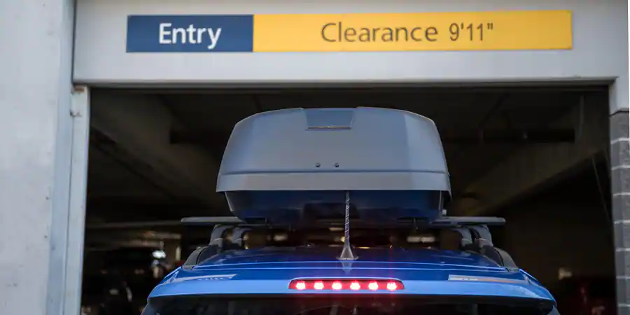 Kennen Sie die Höhe Ihres Fahrzeugs mit Dachbox: Ein weiterer wichtiger Schritt zur Vermeidung von Kollisionen mit Strukturen mit geringer Bodenfreiheit ist, die Höhe Ihres Fahrzeugs mit der Ladefläche und allem, was Sie sonst noch dort oben transportieren, zu kennen. Auf diese Weise wissen Sie, ob Sie durchpassen, wenn Sie ein Schild mit der Höhe einer Struktur sehen. Verwenden Sie ein Maßband, um die Zahl herauszufinden, und notieren Sie sie, damit Sie sie nicht vergessen.