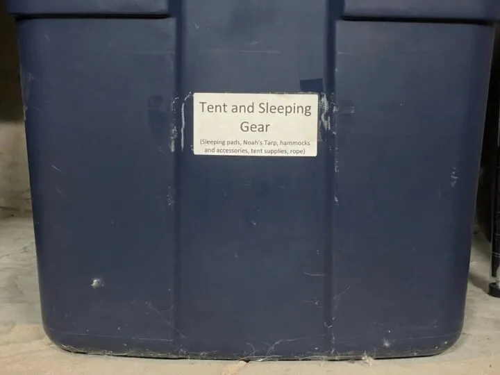 Zum Beschriften meiner Mülltonnen bevorzuge ich getippte Etiketten gegenüber handgeschriebenen. Ich finde, das sieht ordentlicher aus, und ich mag meine Handschrift nicht. Ich verwende gerne Versandetiketten mit einer großen Überschrift mit dem Hauptinhalt, z. B. „Wasserversorgung und -lagerung“, und darunter etwas ausführlicherem Text, z. B. „Trinkblasen, Flaschen, Feldflaschen, Packsäcke und Mülleimer“. Dann klebe ich sie einfach in die Tonne! Manchmal braucht man etwas zusätzliches Klebeband, um sie festzuhalten, aber meistens halten sie, wenn sie nur im Keller stehen. Die Versandetiketten lassen sich auch sauber abziehen, wenn sie ausgetauscht werden müssen.