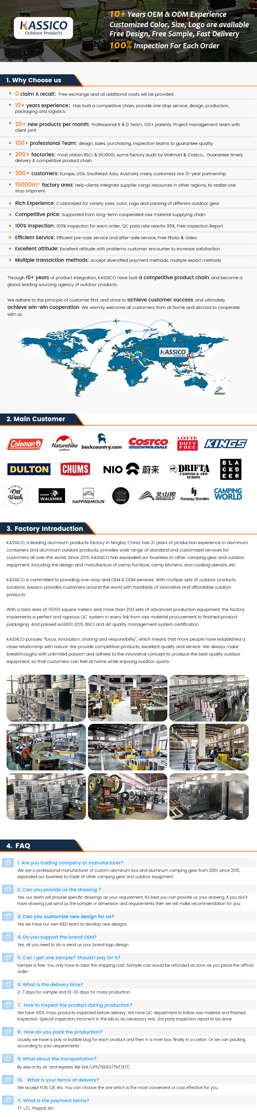 KASSICO ist Branchenführer mit über 100 Arten von Outdoor-Ausrüstung in kundenspezifischem Design, Konstruktion, Fertigung und Kundendienst für Campingzelte, Schlafausrüstung, Möbel und Küchen. Wir bieten eine Vielzahl von kundenspezifischen Designs für Logos, Größen, Farben, Verpackungen und Oberflächen, um Ihren speziellen Anforderungen gerecht zu werden. KASSICO verwendet hochmoderne Fertigungsanlagen und kundenspezifische Fertigungsprozesse, um sicherzustellen, dass Ihre Campingausrüstung Ihren Spezifikationen entspricht. Alle unsere Materialien erfüllen die strengen neuen Energievorschriften.